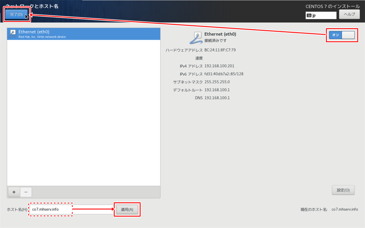 ホスト名が決まったら、インターフェースを [オン] にして接続を有効にして、[完了] をクリックします。 |