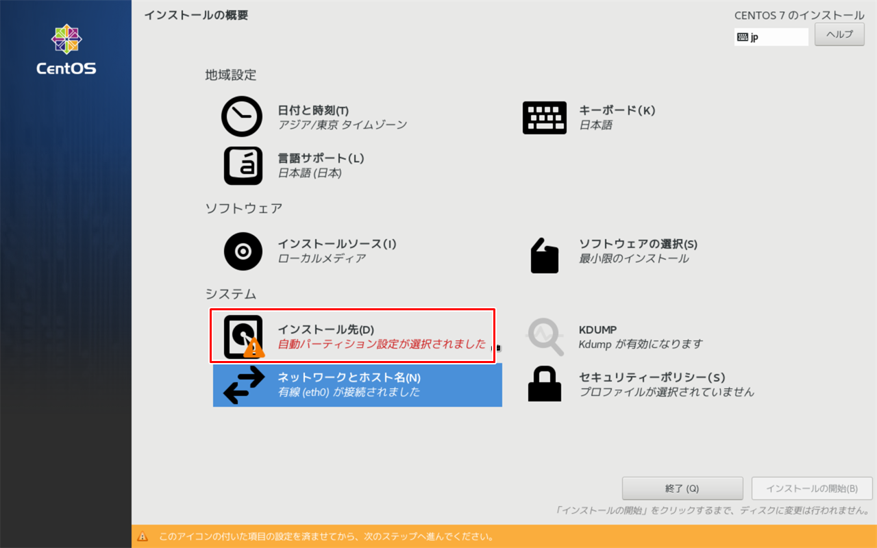 インストール作業中にrootユーザのパスワードを設定します。[ROOT パスワード] をクリックします。