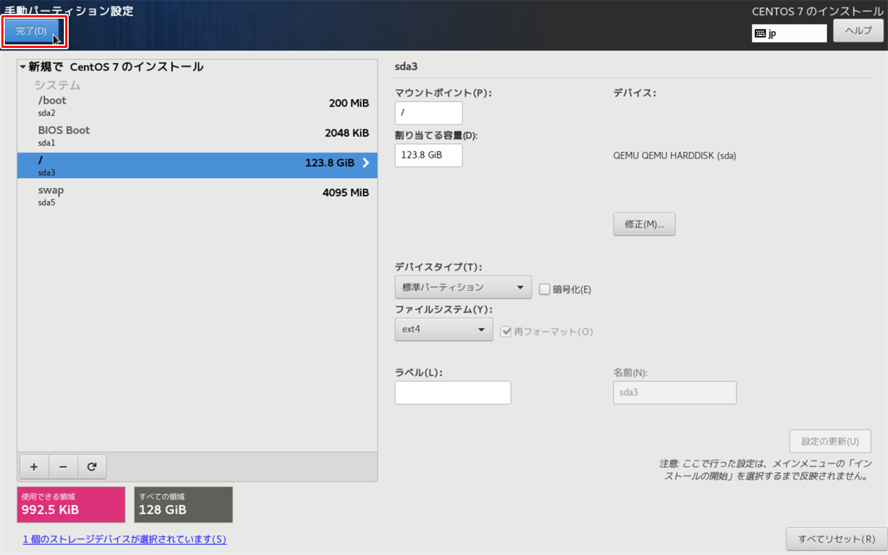 パーティションを自動設定のまま進む場合は [完了]、自分で設定をする場合は [パーティションを自分で構成する] にチェックを付けてから [完了] をクリックします。 |